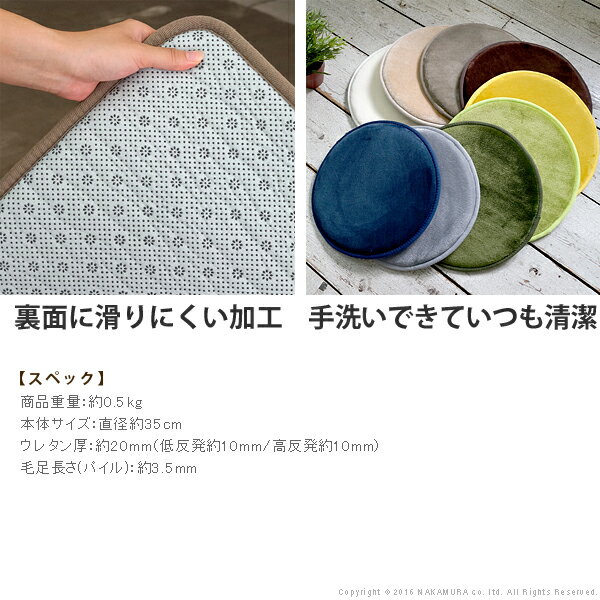 【カラーバリエーション】 ブラウン・ライトブラウン・ベージュ・アイボリー・グレー・マスタードイエロー・グリーン・ライムグリーン・インディゴ 【仕様】 本体:ポリエステル100%(フランネル) 裏面:不織布(滑り止め加工) 中材:ウレタンフォーム 【サイズ】 本体:直径約35cm ウレタン厚:約20mm(低反発10mm・高反発10mm) 毛足長さ(パイル):約3.5mm 重量:約0.5kg 株式会社ナカムラ(33100127)広告文責:株式会社ノースウェブ Tel 0144-52-0018※この商品はメーカー(産地)より直送のため、他の商品との同梱はできません。