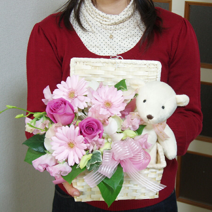 この商品は母の日期間はお休みとなります 内容 生花 フラワーアレンジメント オプションで くまのぬいぐるみ ※うさぎは終了しました メッセージカード付き(ご希望により) アレンジ材料 季節の花 バスケット 花のサイズ 約幅30cm×20cm×高さ25cm ※多少のずれはご了承ください。